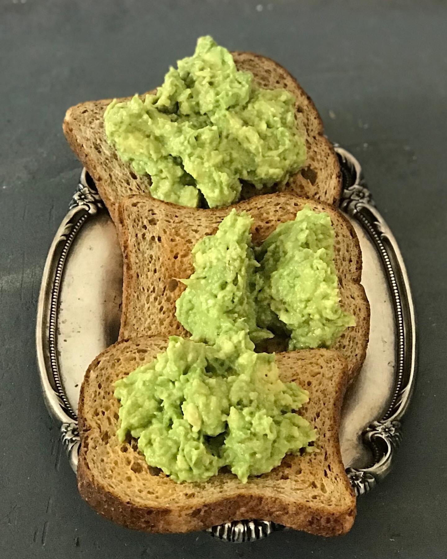 These three toasts carry one garlic clove, each… and to accentuate paradise, avocado, Merlot salt, olive oil, pumpkin seed oil, and garlic, on sourdough toast.