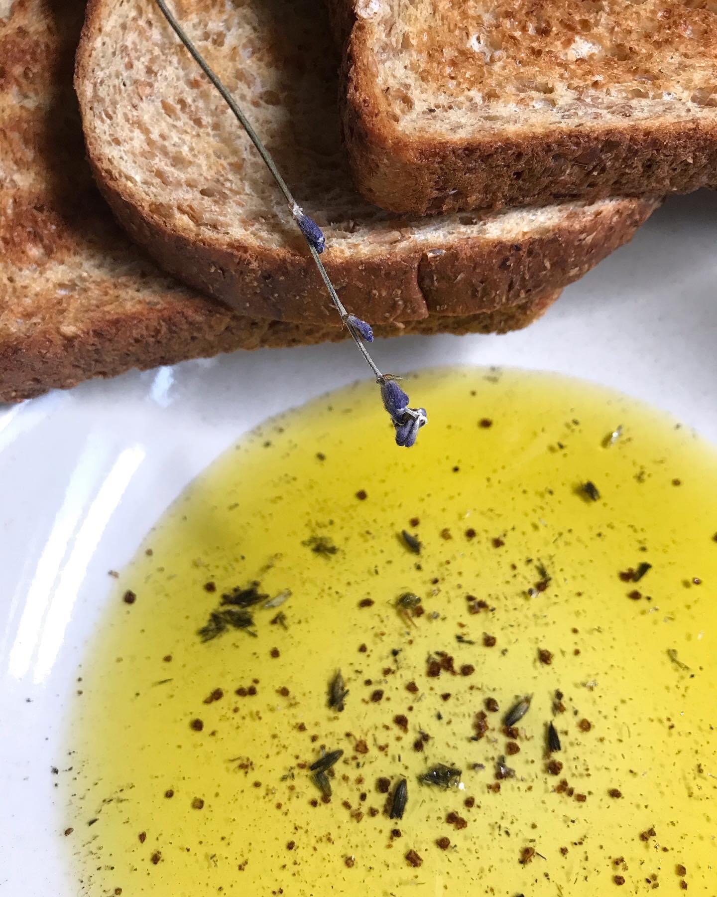 One true feeling of paradise for me, has been the memory of some childhood dishes. Dipping slices of toast on fine olive oil, was — at least in my memory — a common breakfast. Fresh garlic and a pinch of salt floated on the oil. This is one variation: wild French lavender and espresso salt on this magnificent Californian olive oil from Napa Valley Naturals, or any high quality olive oil of choice.