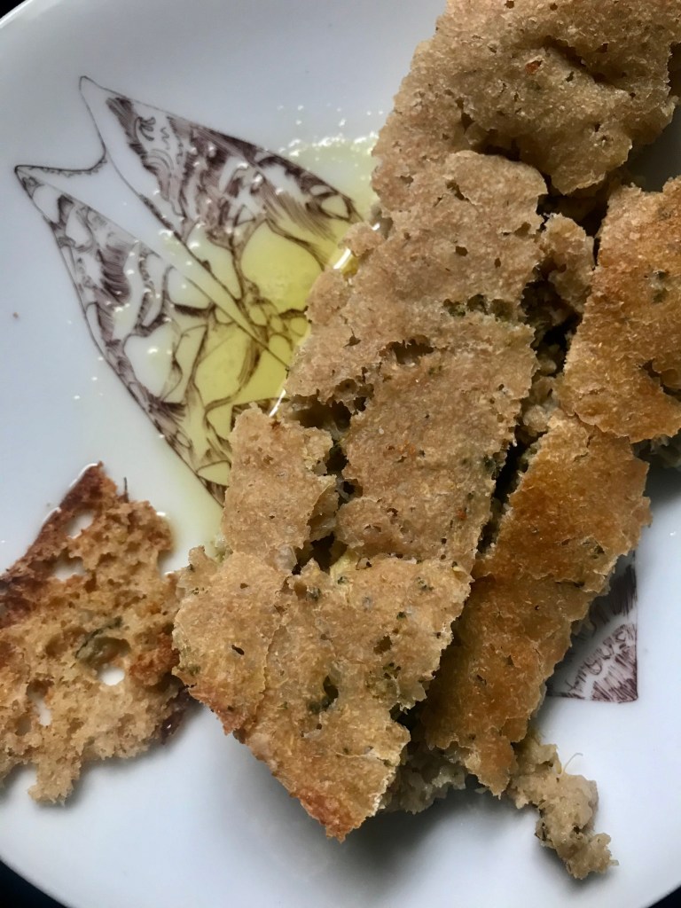 Fresh homemade broccoli bread, and olive oil (on a mid century Heinrich & Co Selb Bavaria plate, with a Conus aulicus print.)