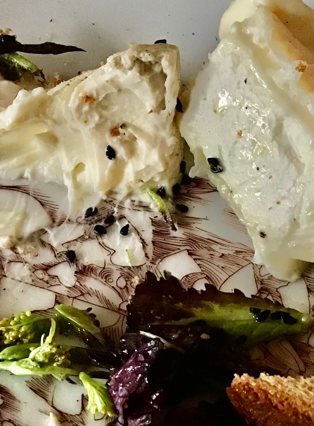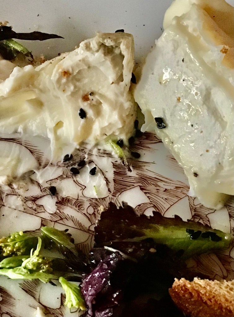 Rouzaire and Robiola cheeses, black sesame seeds, mustard leaves and flowers.