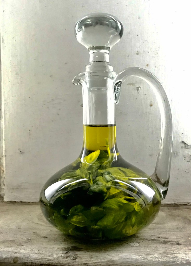 During this October transition, I was trying to make my basil plant believe that fresh air would do well. Within two days it displayed a very different opinion through many wilted leaves. I cut several twigs and put the healthy leaves, large and tiny, in one of my olive oils.
