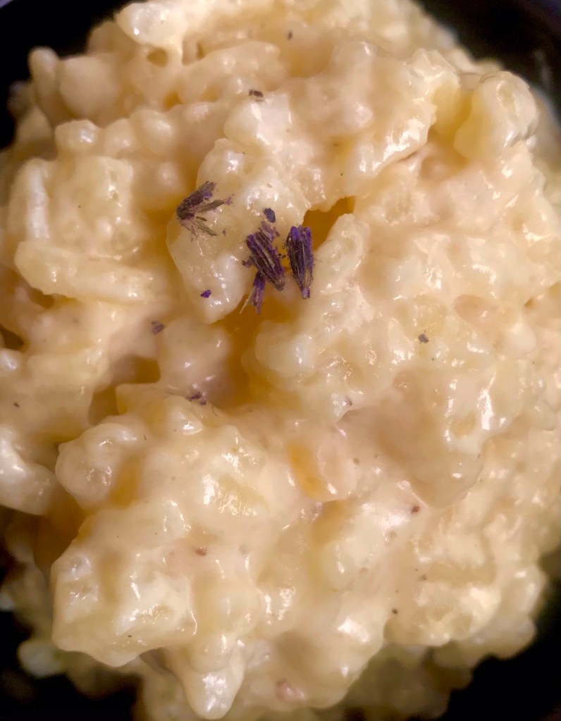 After taking one cup of Arborio rice — yes, the same I use for risotto — tree of milk, five tablespoons of brown sugar, two pinches of Afghan saffron, two cardamom pods, and waiting some thrifty-seven cooking minutes, I added a tablespoon of cream cheese, dissolved it, and let it rest a few minutes.