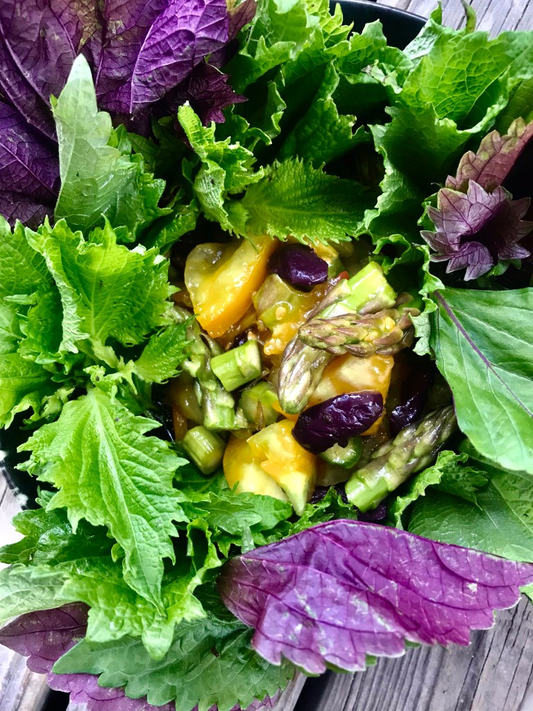 Besides the bananas, I knew the asparagus was reaching a critical stage, and the shiso, and the stripped German tomato, and the asparagus. Olives, however, seem inmortal.