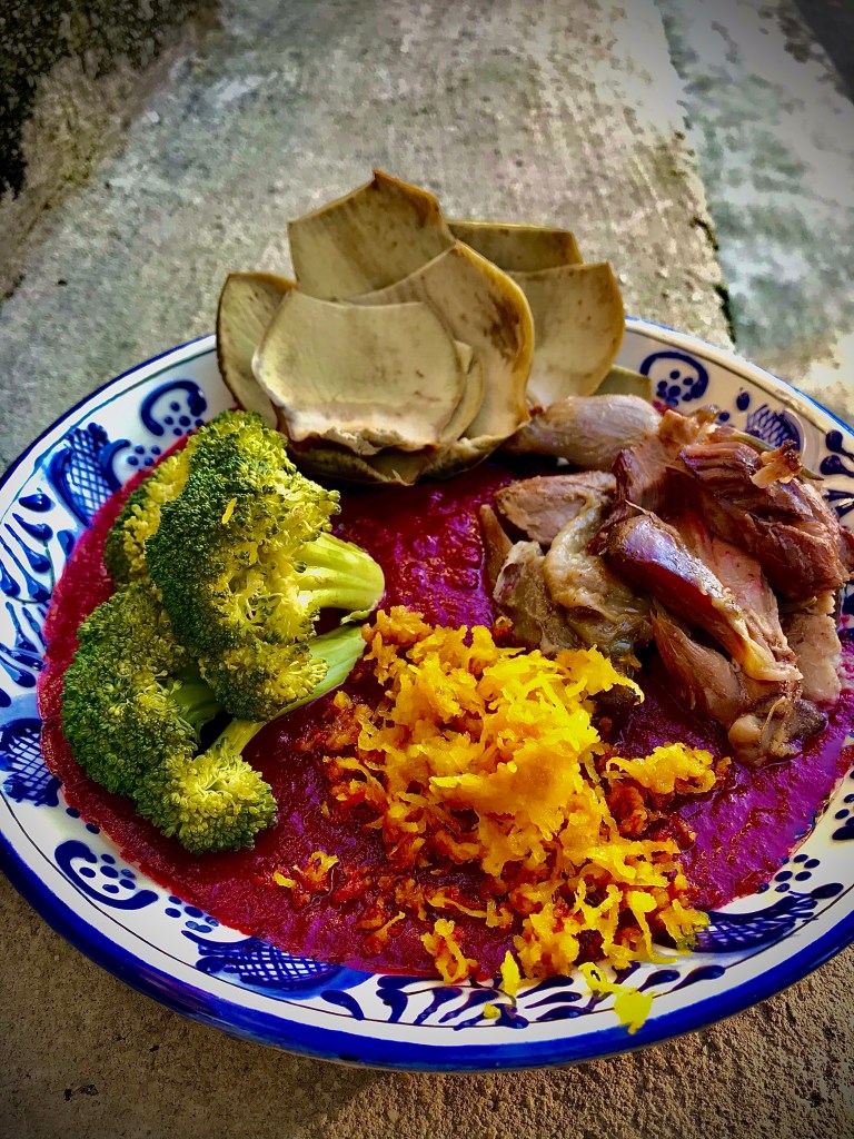 Days ago I bought a pair of artichokes, and steamed them on the same day but kept one sealed in the refrigerator. That same day I bought a golden beetroot which has been resting moist and cooled. Yesterday I brought home some broccoli, three red beetroots, and shanks of lamb. The shanks took a long hot wine bath, and rested overnight.