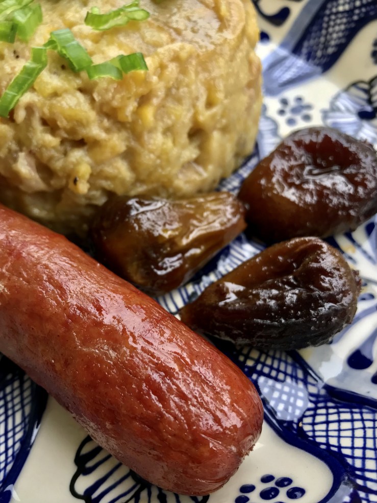 Most of the meals I prepare are born from an idea of what I wish to see and taste. Suddenly the idea of a certain combination came to mind, and I began mentally to compose plantains, sausage, and figs. The figs were to be condensed and sweet. The call was for a vodka reduction with spices, and figs.