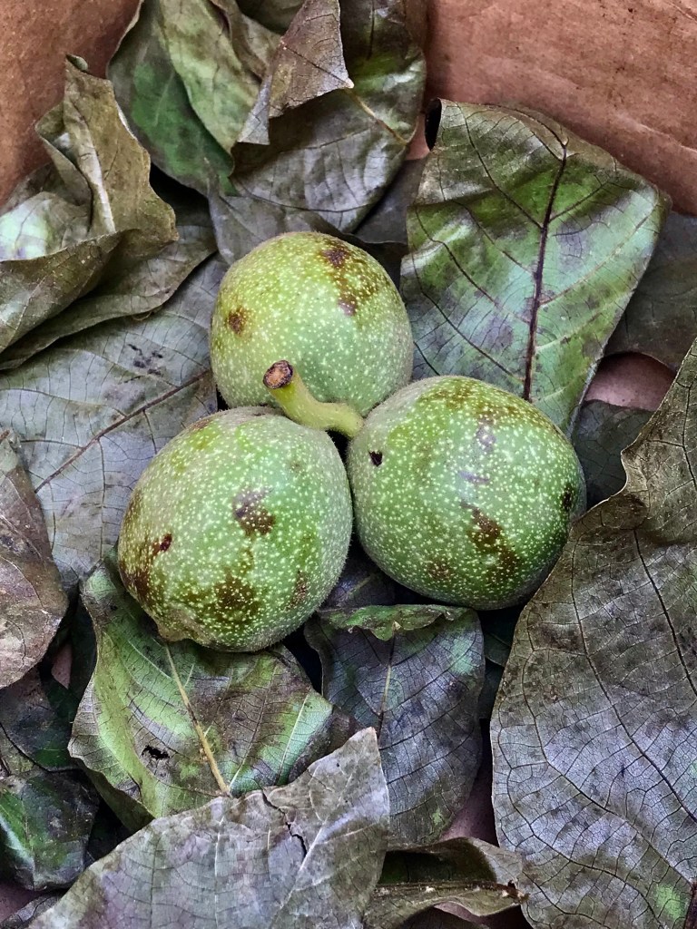 Green Walnut Triplets on Walnut Leaves