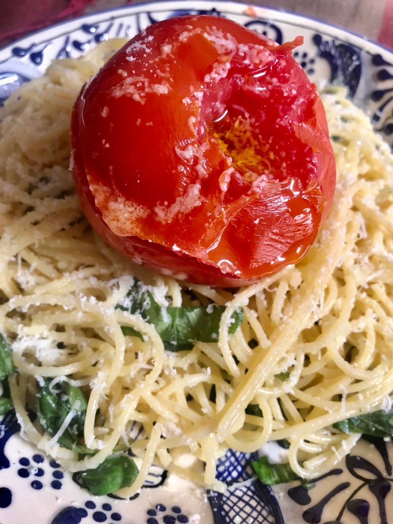 Once the spaghetti is al dente, and out of the water, I drop a tomato in. While the pasta gets the basil, olive oil, and grated cheese added, the tomato will become hot, and pop.