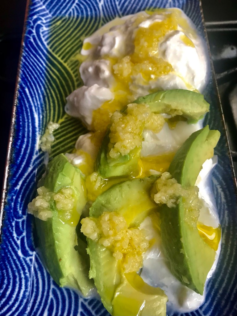 The gentleness of an avocado, next to a subtle cream-stuffed mozzarella, drizzled with a robust olive oil and fresh garlic.