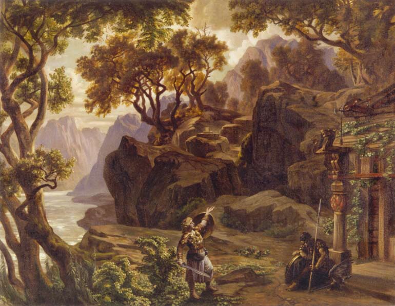 In the hall of the Gibichungs on the banks of the Rhine, Gunther and Gutrune discuss the royal family’s diminishing glory with their half-brother, Hagen. Hagen advises them to strengthen their rule through marriage, suggesting Brünnhilde as Gunther’s bride and Siegfried as Gutrune’s husband. Since only the strongest hero can pass throught the fire on Brünnhilde’s rock, Hagen proposes a daring plan: a potion will make Siegfried forget Brünnhilde and fall in love with Gutrune. To win her as his wife, he will claim Brünnhilde for Gunther. When Siegfried’s horn is heard from the river, Hagen calls him ashore. Gutrune offers the potion to Siegfried, who salutes Brünnhilde as he takes the cup but immediately confesses his love for Gutrune after he has drunk. When Gunther describes his chosen bride, Siegfried offers to walk through the flames for him, using the Tarnhelm to transform himself into Gunther. The two men take an oath of blood brotherhood and set out on their quest. Hagen remains behind to guard the hall.