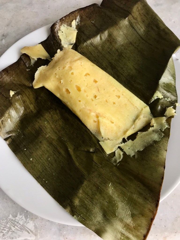 This is an humita from my first batch try. It is a traditional dish, similar to tamales, made with the tender corn, and because of the tender state, it is called choclo, instead of corn. Usually the humita is wrapped in the husk in which the corn grows but I did not have enough. Therefore I decided to use plantain leaves instead.